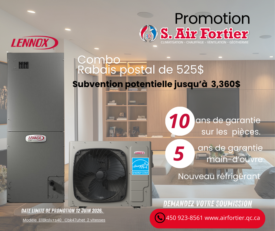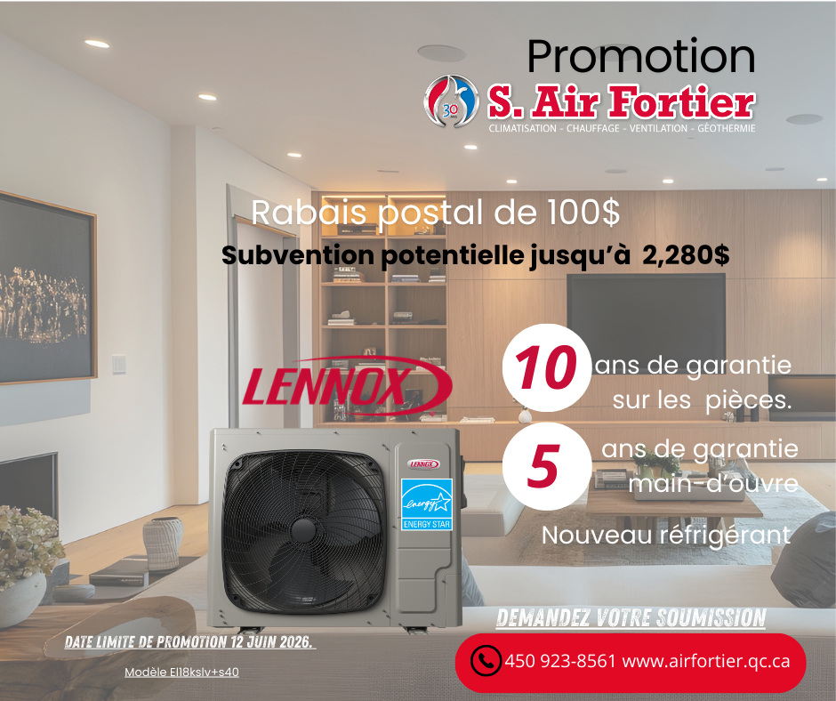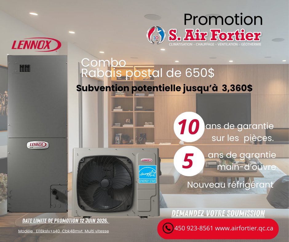 Économisez dès maintenant avec des rabais postaux, jusqu’à 3 360 $ en subventions et des garanties solides — une solution clé en main pour votre confort toute l’année.